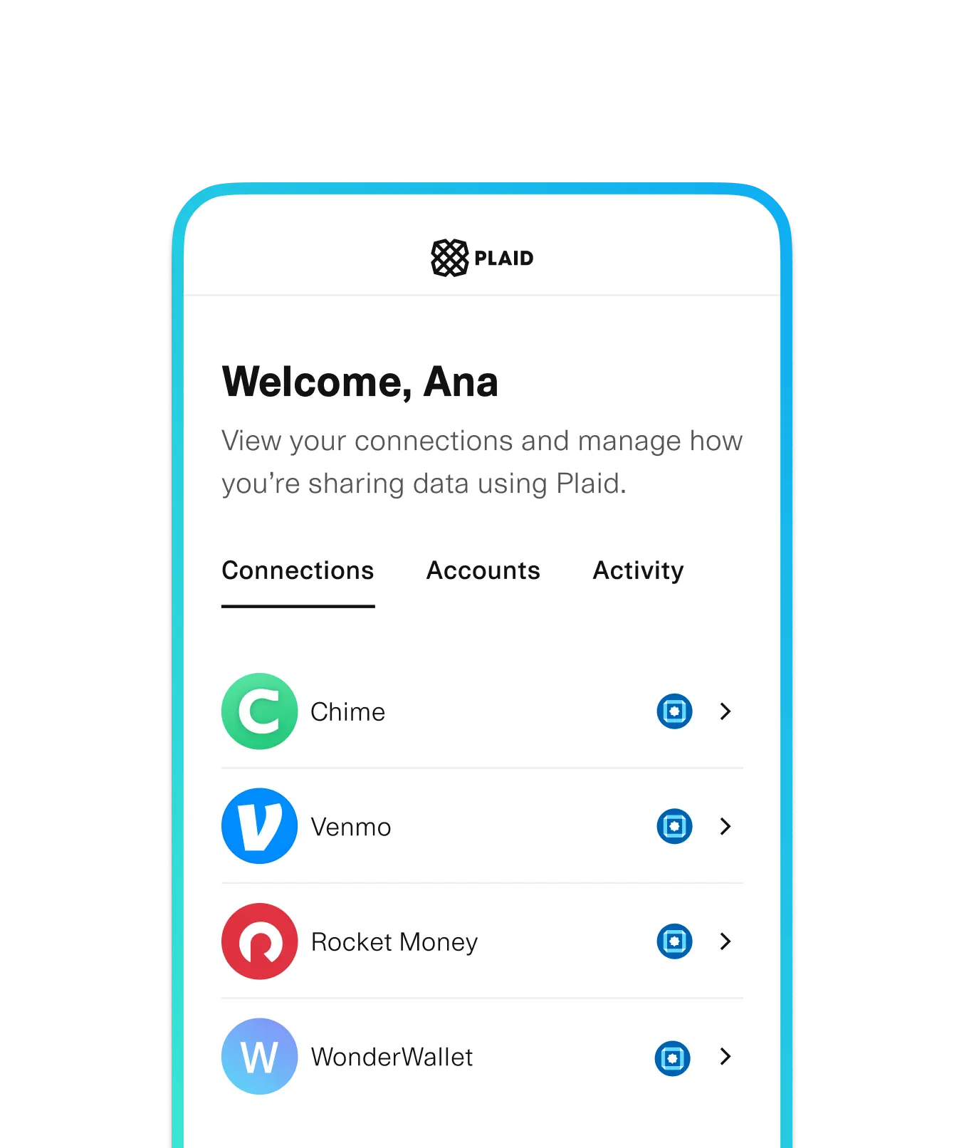 Join the millions of people who connect their financial accounts to apps and services in seconds with Plaid.